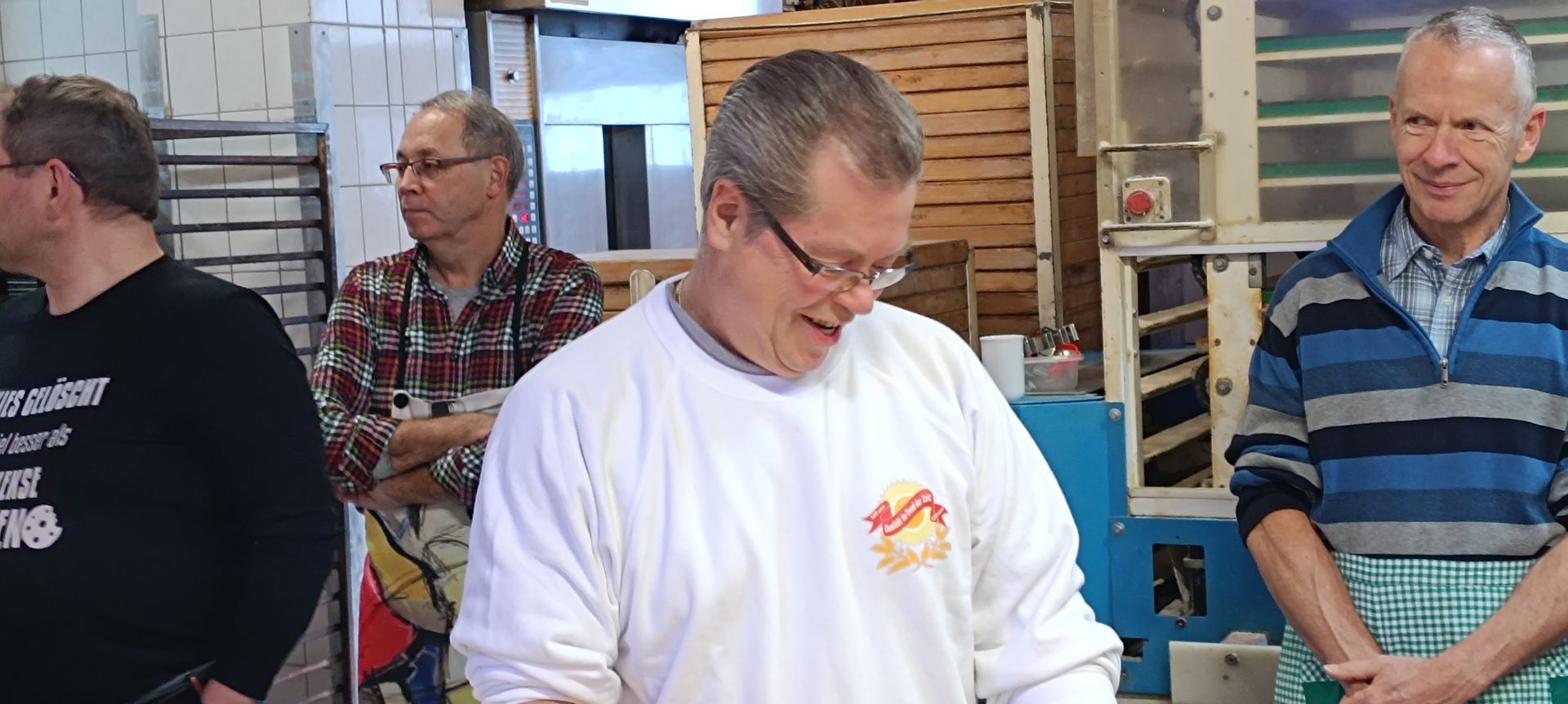 Die Bleche waren gefüllt und der Ofen durfte nun seine Hitze an die Rohlinge weitergeben. Inzwischen war der Grill draußen vor der Backstube vorgeheizt und Grillmeister Klaus testete mit Bratwürstchen die Feuerstelle. Ausreichend Hitze war vorhanden und die Würstchen wanderten in aufgeschnittene Brötchen, die als Tellerersatz hervorragend funktionierten. Später wurden neben den Würstchen Steaks gegrillt und rundeten bei teils alkoholfreien Bieren das Schlemmen ab.